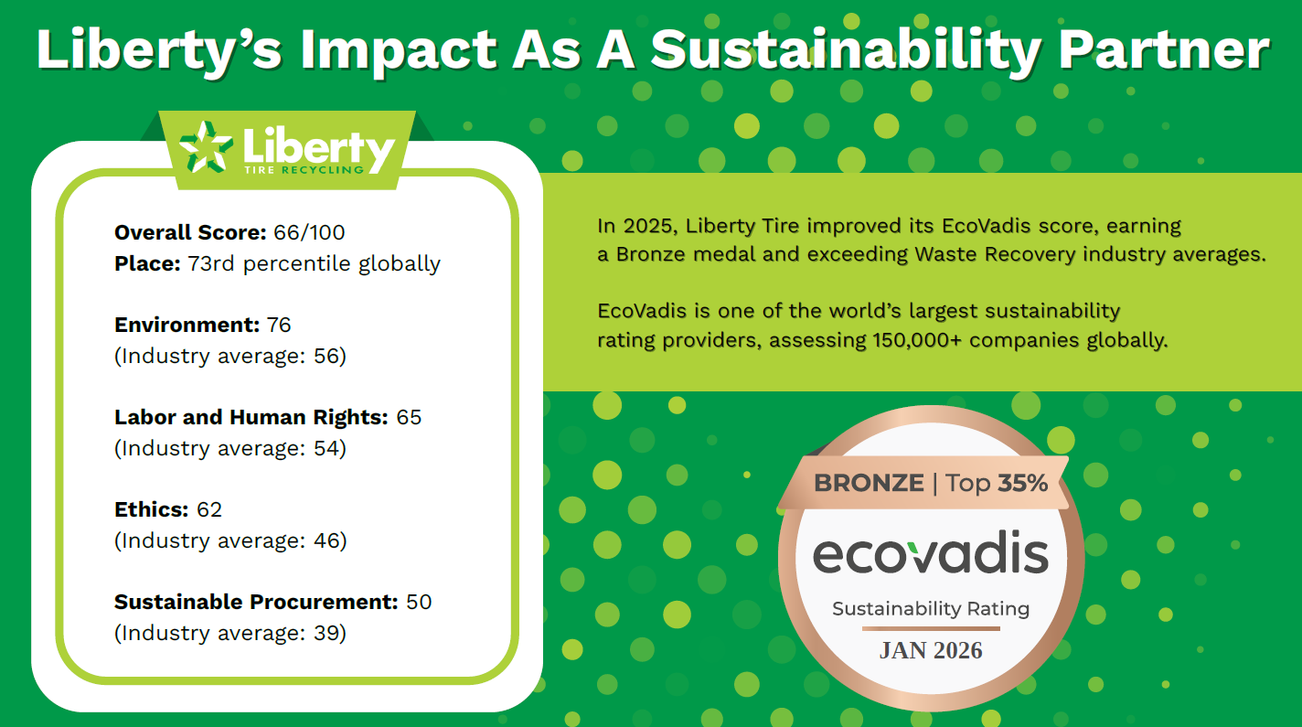 Pittsburgh, PA – February 17, 2026 – Liberty Tire Recycling, the leading tire recycler in North America, has been awarded a Bronze sustainability medal from EcoVadis, placing the company in the top 35% of more than 150,000 rated companies worldwide. The new rating reflects Liberty’s continued progress in building a resilient, transparent, and sustainable business that helps customers reduce environmental and supply chain risk. Liberty Tire Recycling is a sustainability partner that provides nationwide end‑of‑life tire collections and advanced processing that transforms scrap tires into reusable raw materials such as recycled rubber, recycled steel, and other products. Liberty’s family of companies convert end-of-life tires into high‑value products such as mulch, molded rubber goods, sports and recreation surfaces, and advanced construction and industrial materials that help customers meet their sustainability and performance goals. In only its second year of participation, Liberty improved its overall EcoVadis score to 66/100, achieving a 73rd percentile global ranking and outperforming Waste Recovery industry averages across all four EcoVadis themes: Environment, Labor & Human Rights, Ethics, and Sustainable Procurement. Liberty scored 76 in Environment, 65 in Labor & Human Rights, 62 in Ethics, and 50 in Sustainable Procurement, compared with industry averages of 56, 54, 46, and 39, respectively. “This recognition affirms that our sustainability strategy is ambitious, measurable, and credible,” said Amy Brackin, Senior Vice President of Sustainability at Liberty Tire Recycling. “Earning a Bronze medal in our second year demonstrates that Liberty is a partner our customers can rely on to help meet their own circularity and responsible sourcing goals.”