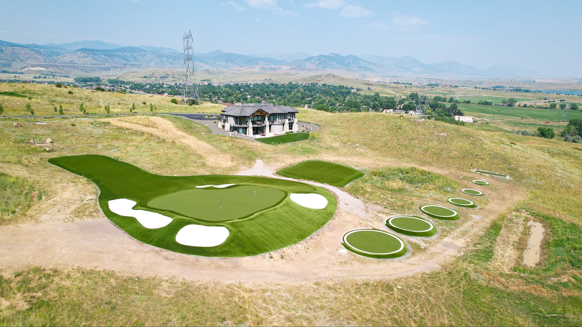 Nestled amongst the rolling foothills near Denver, Colorado, a golfer's paradise emerges from a sloping 5-acre plot converted into one of the largest private residential golf facilities in the United States. The massive custom golf complex features six