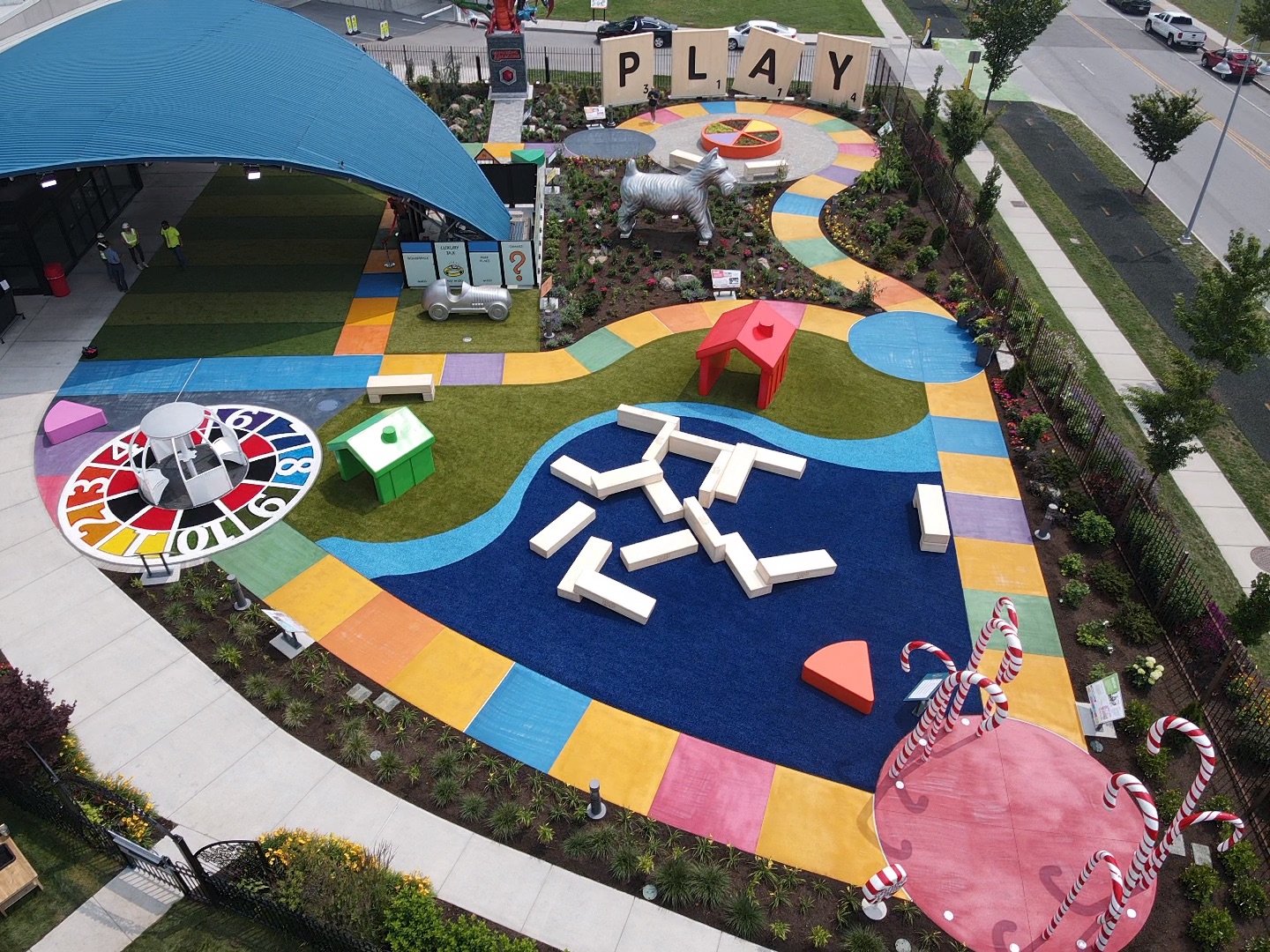 Game Park, a 17,000-square-foot outdoor space offers an interactive, educational experience for children of all abilities, featuring multicolored turf, custom game-themed designs, and tactile elements that encourage safe developmental play.